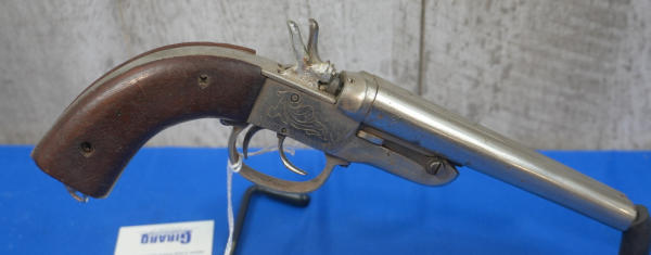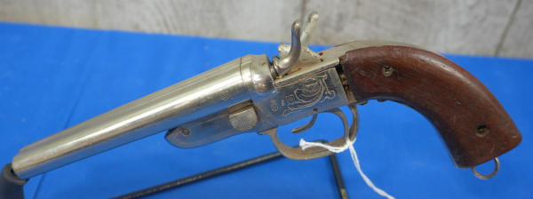 5" Nickel Barrels; has wear and rusting; wood grips; left mech works, right mech won't operate and trigger is bent; Antique and no transfer; SN#4624