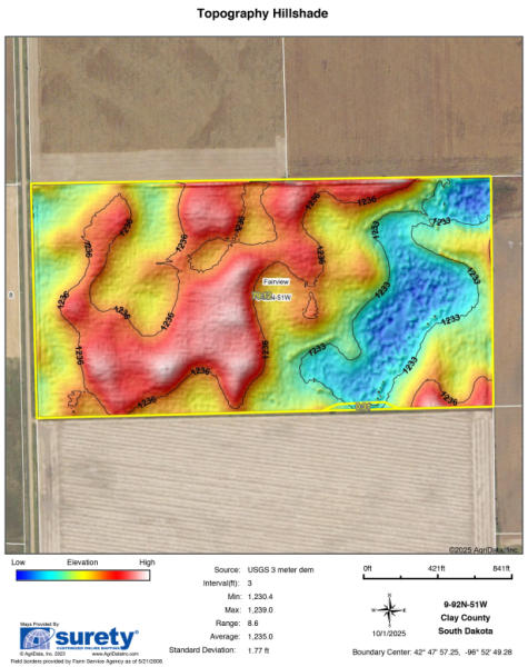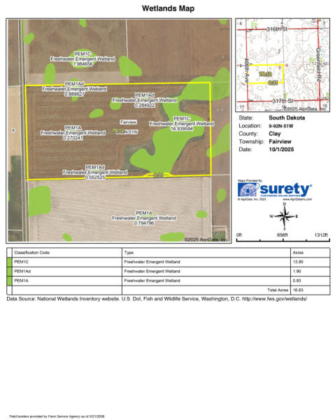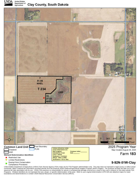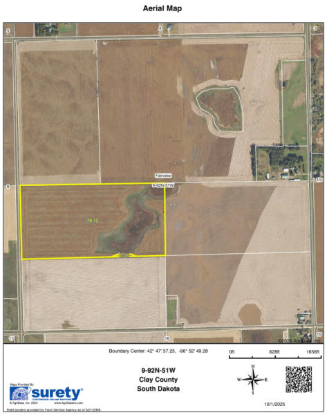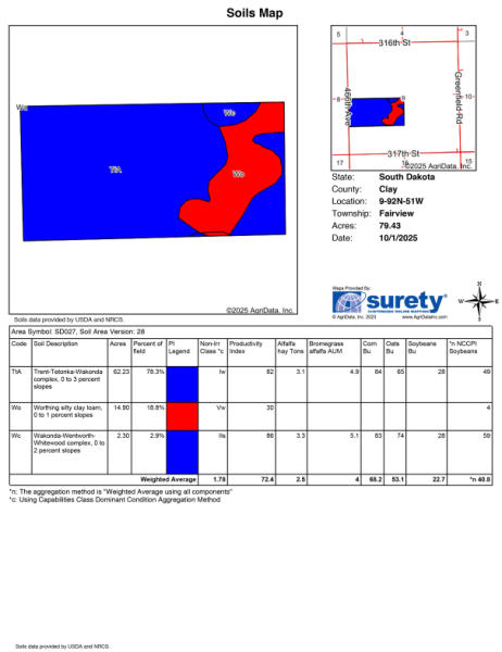 Legal: N 1/2 of the SW 1/4 in Sec 9-92-51, Fairview Township, Clay County, SD. 80.66 Taxable Acres. 2024 Taxes are $2,329.96.