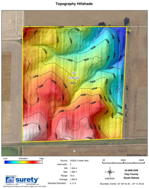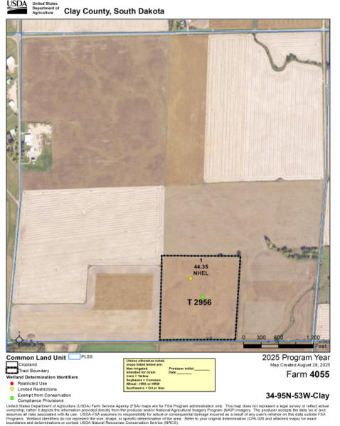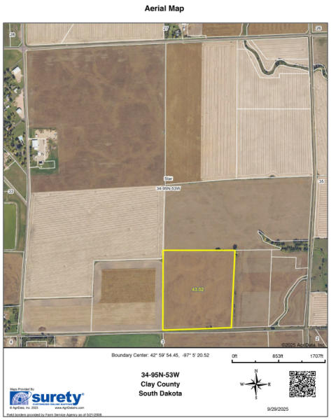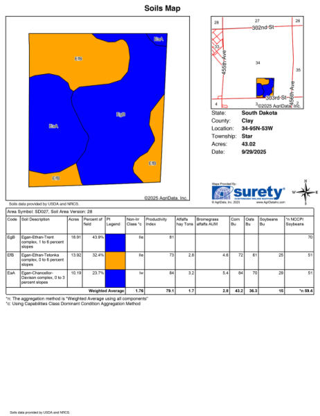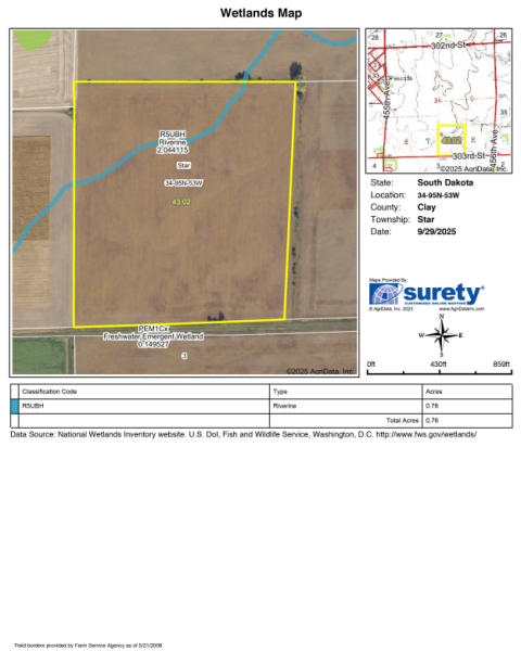Legal: SW 1/4 of the SE 1/4 in Sec 34-95-53, Star Township, Clay County, SD. 45.4 taxable acres. Taxes are $1,343.46.