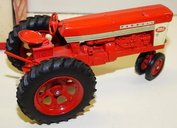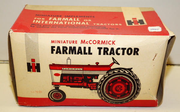nice original tractor, 97% condition with some paint chips on the grill and steering wheel; box is complete and good color, a little crushed on one end has some stains on it, overall box rates 8.25 condition; original grey muffler is in the box too, but no liner