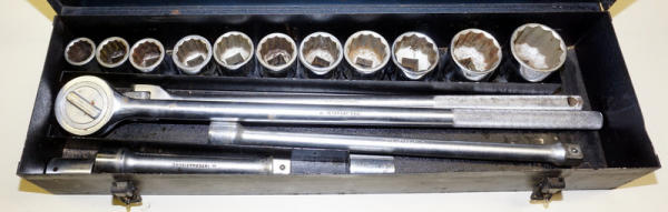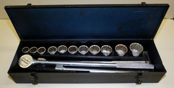 good used set, some general wear to the tools, tool box has been painted black and emblem painted red, used, but a good set