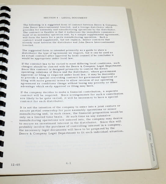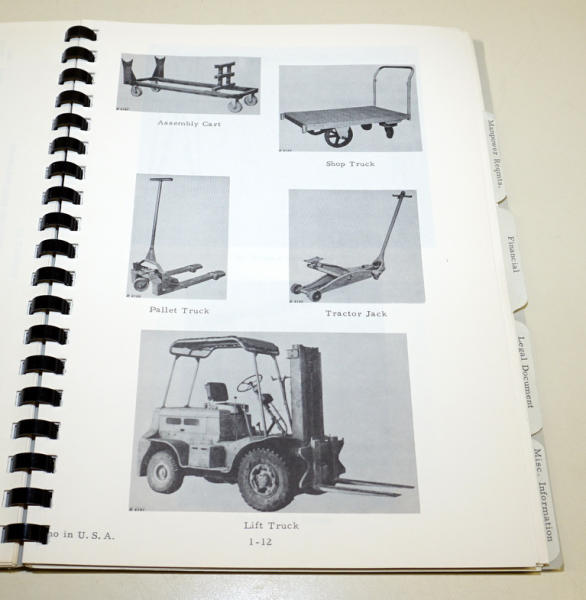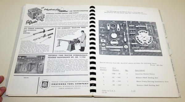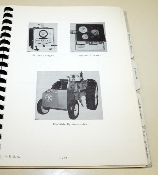 over 50 pages, includes info on assembling tractors at the dealership, plus tools and specialty items that will be needed like splitting stands, even how to set up the shop, clean and near mint