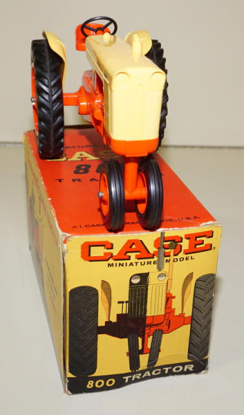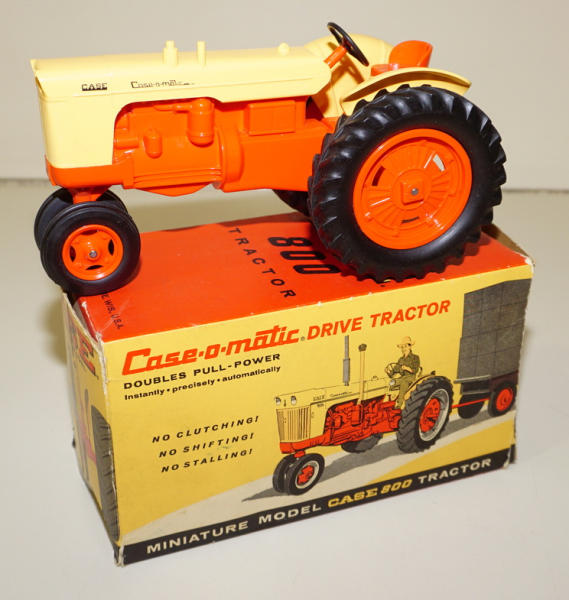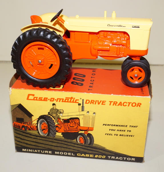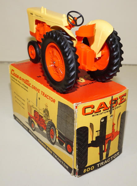 1950's plastic tractor, no #'s on the hood version; mint original toy, rear rim wants to come off the axle, not damaged, I think just shrank a little with age; clean and nice original box with great graphics, some edge wear, overall box rates 8.5 condition; one of the best graphic vintage boxes ever produced!