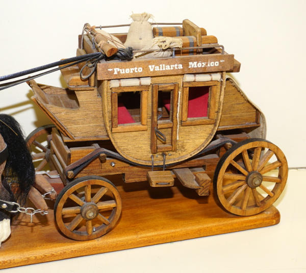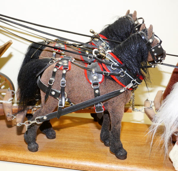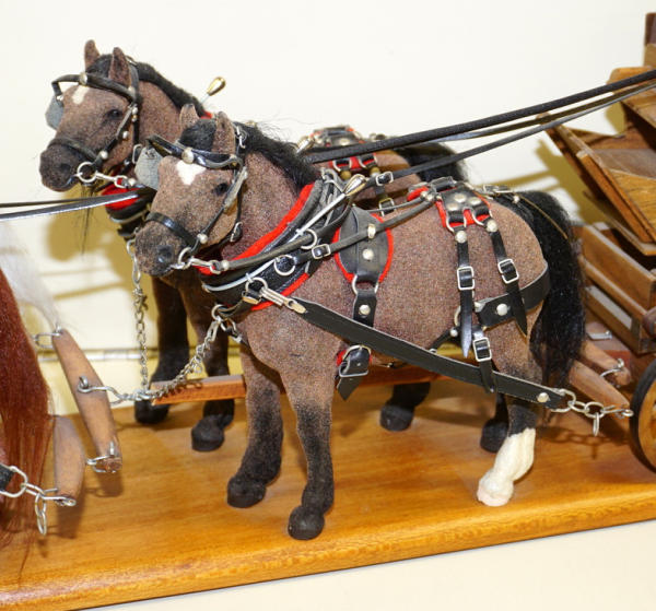 27" long overall, horses are a little smaller than Breyer, custom flocked, manes, leather show harness and more, Stagecoach looks to be hand made and very nicely done