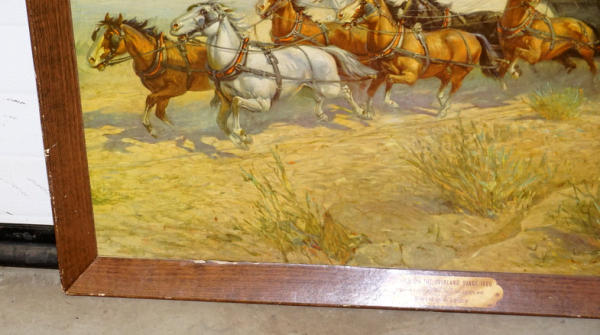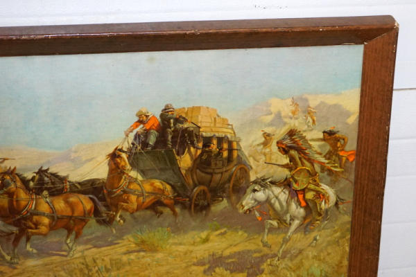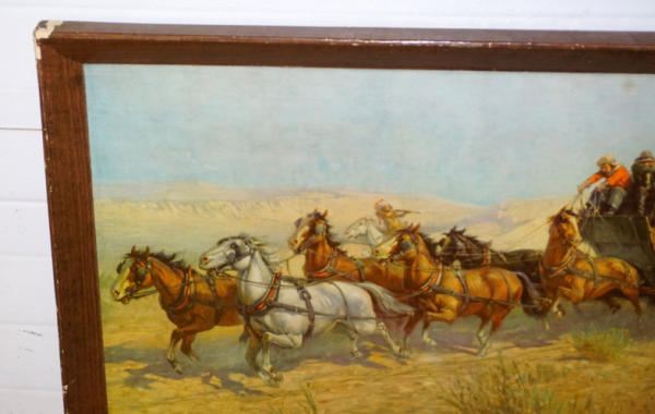 28"x42", some chips and wear to the cardboard frame, but the scene is nice, looks good
