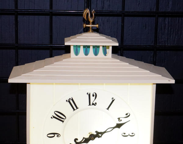 25"x13", works, has the finial rooster, but not attached in the picture, white has discolored some from age/bar smoke