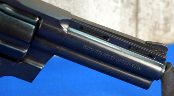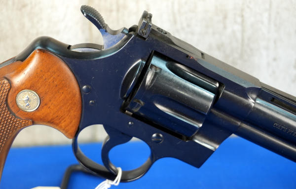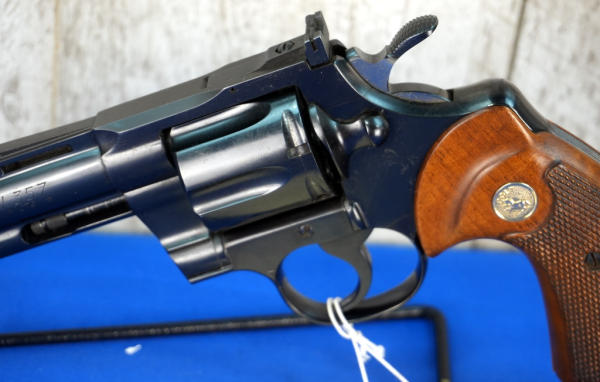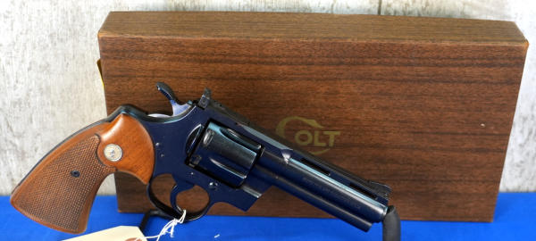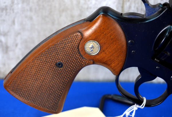 4" VR-BBL; wood checkered grips; 6-shot swing out cylinder; this is a 1-owner gun and said his father had it by his bed most of his life so it's only been fired a handful of times; original factory box; 1970's production; USA: SN#E9470; A-265