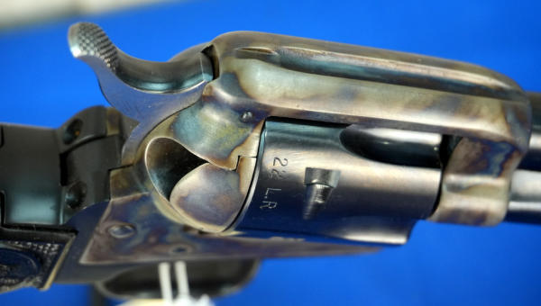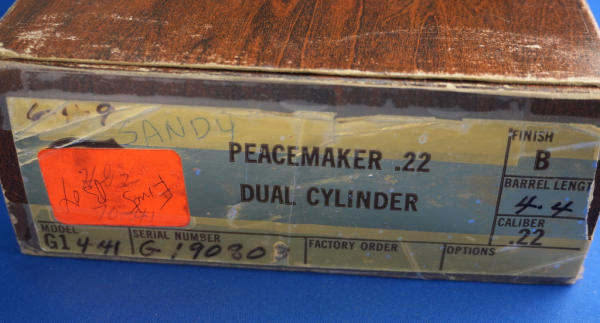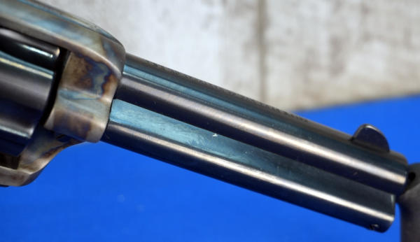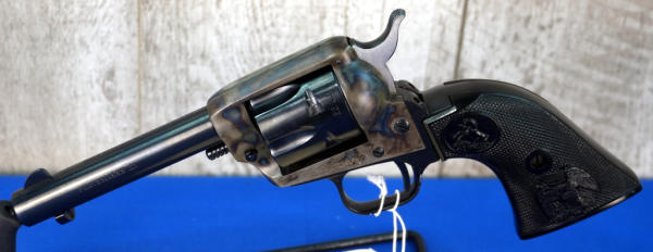 4-3/8" BBL; case hardened receiver; black plastic checkered grips; original factory box; comes with both LR & mag 6-shot fixed cylinders; mint & unfired; USA; SN#G139243; A-280