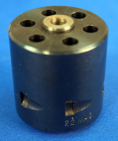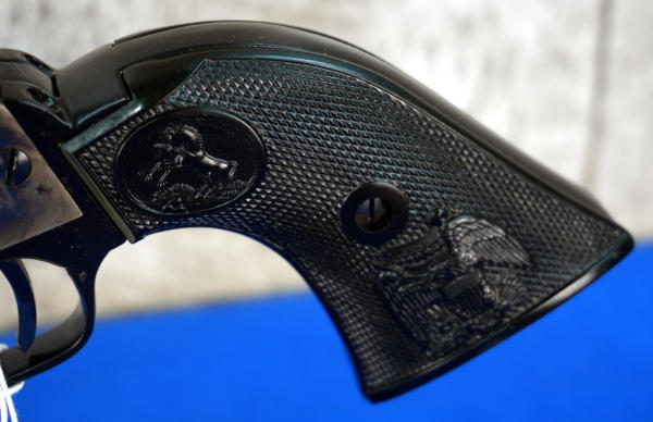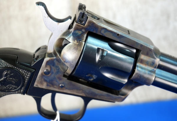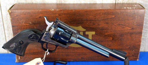 6" BBL; case hardened receiver; black plastic checkered grips; factory box; both LR & Mag 6-shot fixed cylinders; looks mint & unfired; USA; SN#G206871; A-280