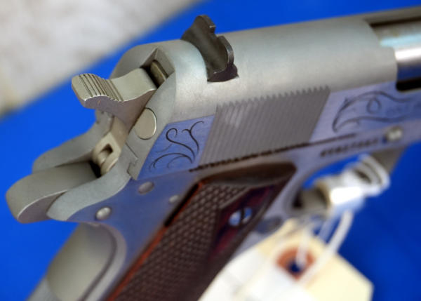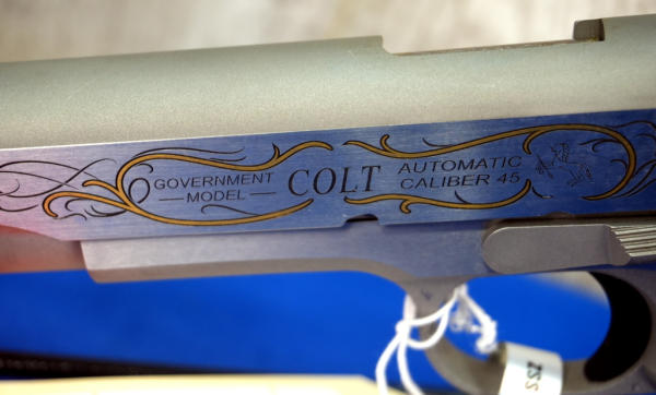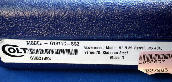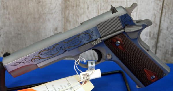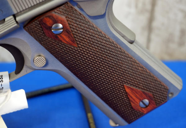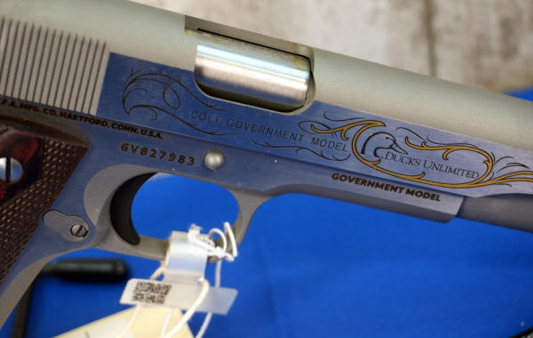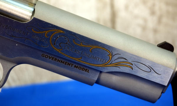 5" Stainless Barrel; wood checkered grips; mint & unfired w/factory hard case; engraved slide w/DU Logo & gold accent; USA: SN#GV027983; A-289