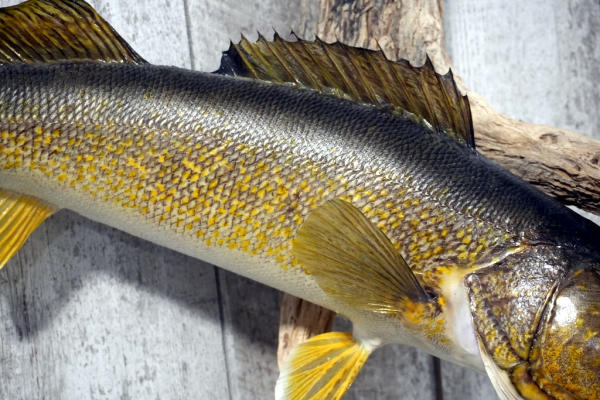 looks to me about 28" if laid flat!; beautiful fish; mounted to drift wood; NO SHIPPING, local pickup only