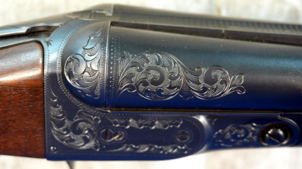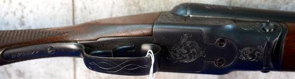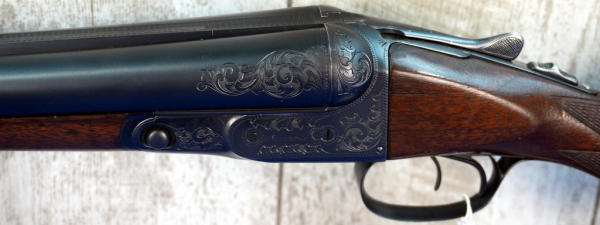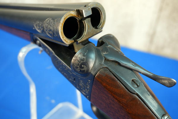 30" BBLs; easy break action; two triggers; very nice wood w/great color & checkering; blued receiver; factory scroll engraving on receiver and portion of the barrel; plastic butt plate w/embossed dog; Vulcan Steel; Left-FC, Right-IM; USA; SN#118020; A-317