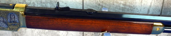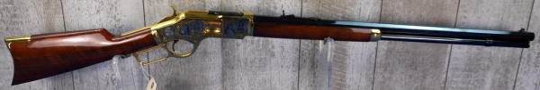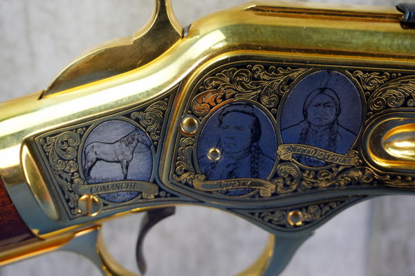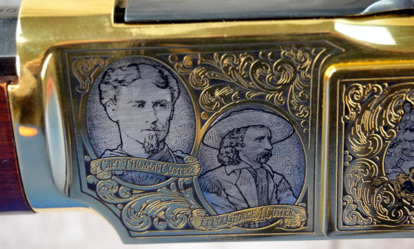 24" Oct. BBL; super bright bluing; gold receiver, forearm cap, lever, hammer, buttplate; highly engraved w/several Indian Chiefs - Comanche, Curly, Sitting Bull, Gall, Low Dog & US Generals Capt. Thomas Custer, Lt. Col. George Custer & Boston Custer!; No.68 of 500; A&A Engraving of Rapid City; comes with a wood showcase & a plaquard; beautiful piece of South Dakota History! Italy; SN#W06092; A-239