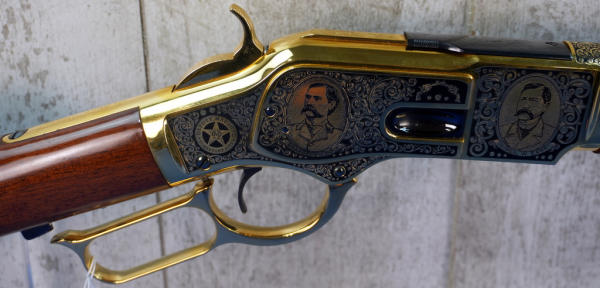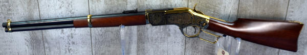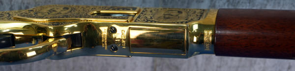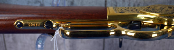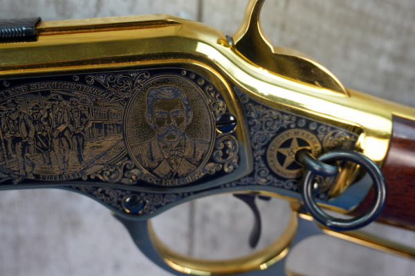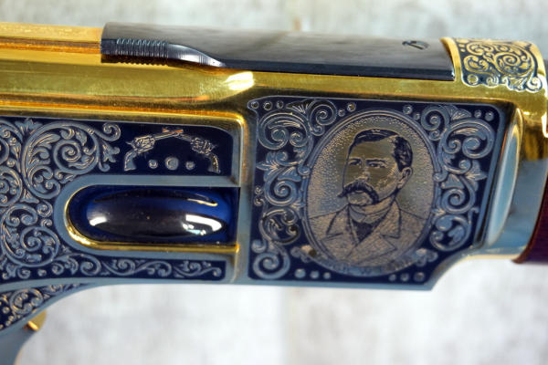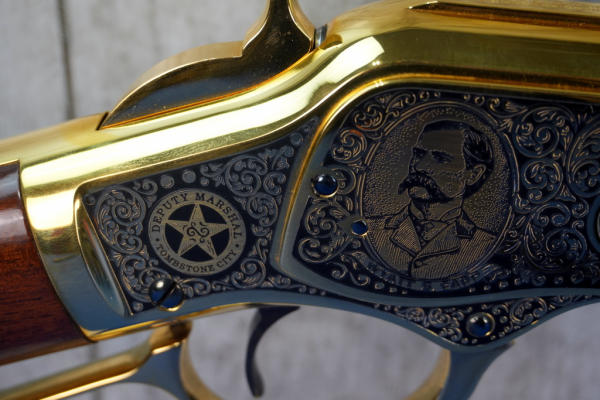 19" BBL; gold receiver w/bands, caps, sights, hammer, lever & butt plate! Highly engraved receiver w/Wyatt Earp, Virgil Earp, Morgan Earp & Doc Holliday! This is No.1 of 300!; A&A Engraving; no box but mint & beautiful firearm! Italy; SN#72806; A-255