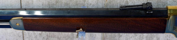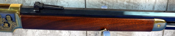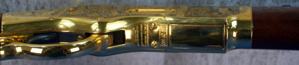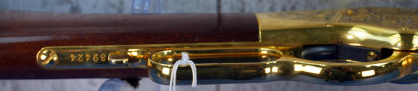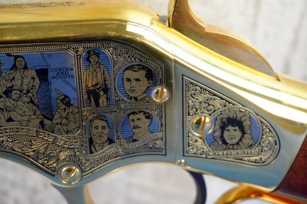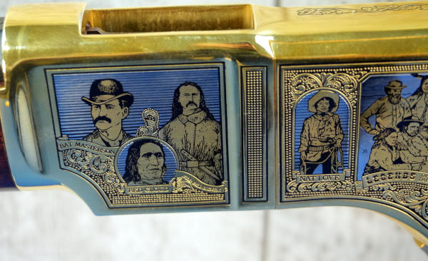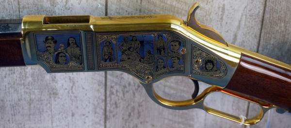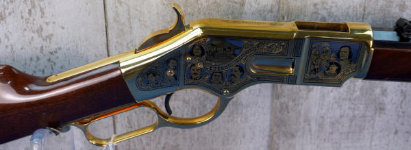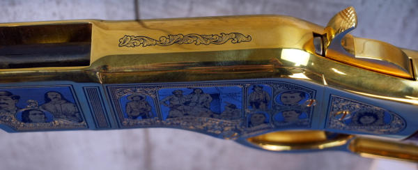 24" Oct. BBL; gold receiver, tube cap, forearm cap, hammer, lever & butt plate; highly engraved receiver w/Belle Star, Judge Parker, Geronimo, Doc Holliday, Chief Joseph, Wyatt Earp, Sitting Bull, Buffalo Bill, Annie Oakley, Kit Carson, Bat Masterson, Red Cloud, Wild Bill, Nat Love, Billy The Kid, Bob Ford, Roy Bean, Pat Garrett & Cattle Kate! No. 189 of 500; A&A Engraving; No box but mint firearm! Italy; SN#89424; A-255