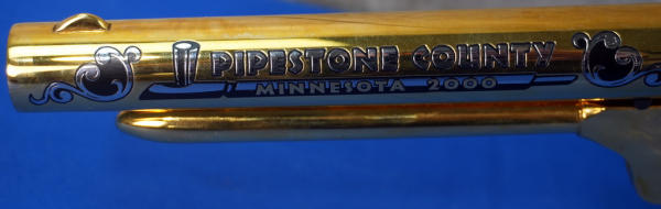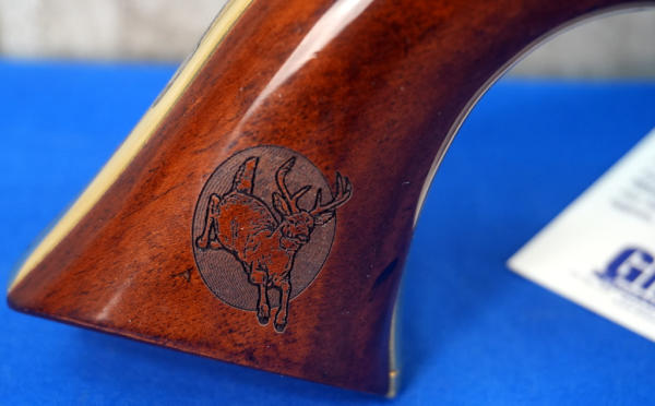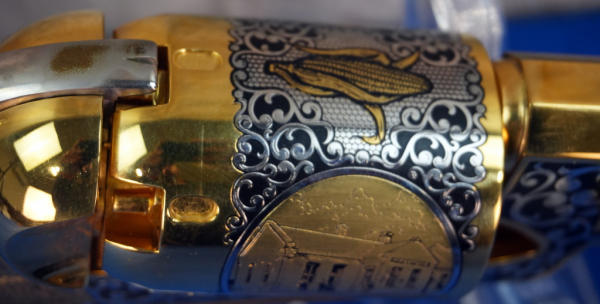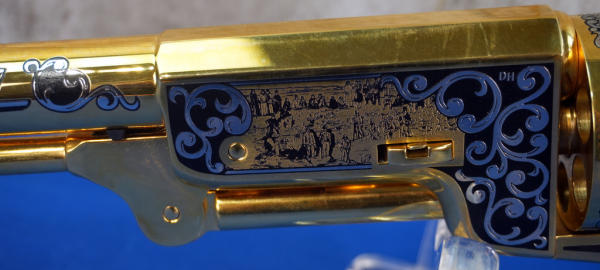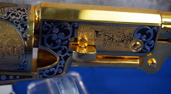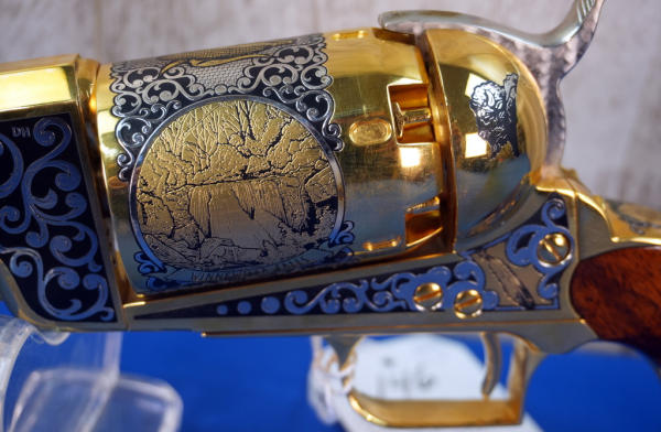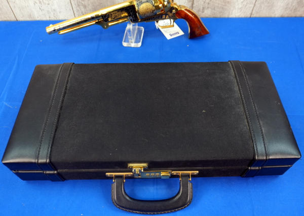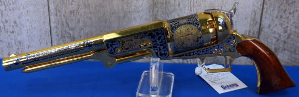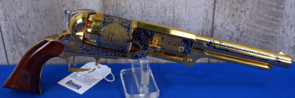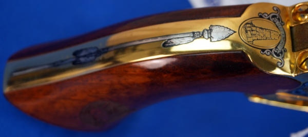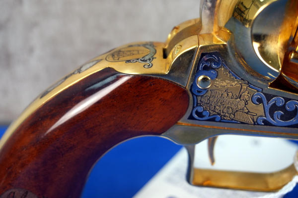 9" Barrel; all gold plated and highly engraved; jeweled hammer; smooth wood grips; No.1 of 10!; A&A Engraving; has Winnewissa Falls, Rock Island Depot, Train, Buffalo Head, Whitetail deer and more! Has a fitted padded case; wonderful piece! No Transfer needed due to blackpowder; Italy; SN#14567
