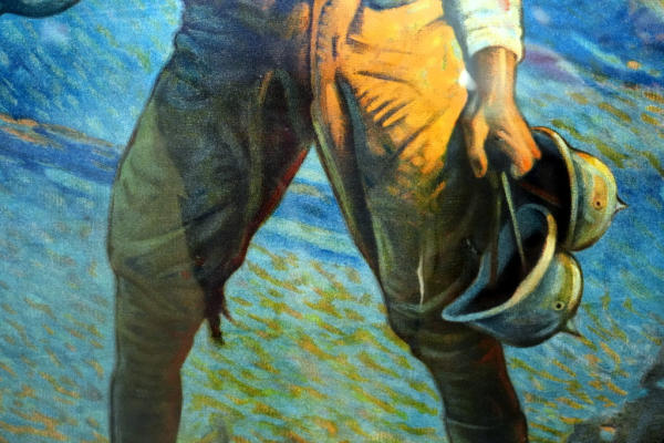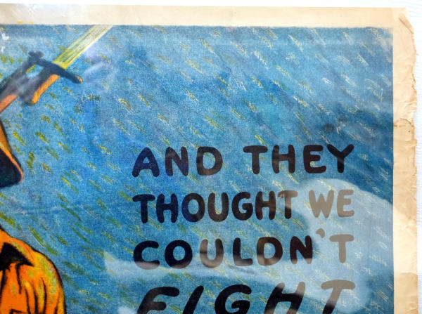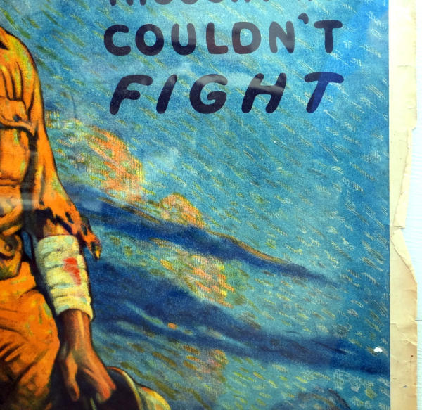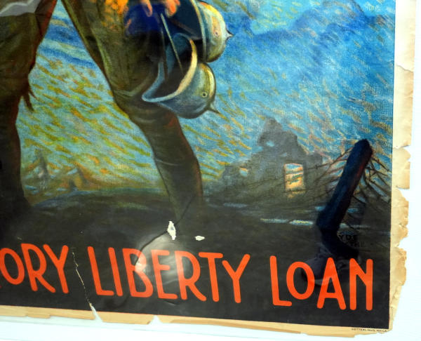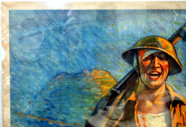 has damage around the edges and a tear on the bottom; but an amazing litho of a soldier and great color!; in plastic sleeve; 41"x30"