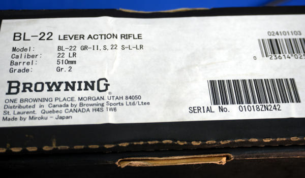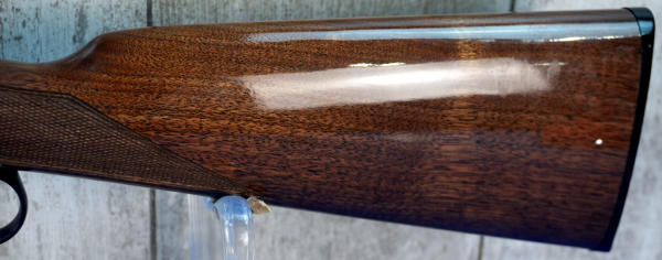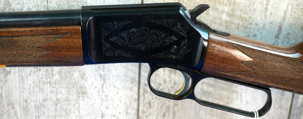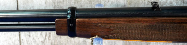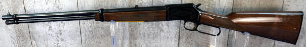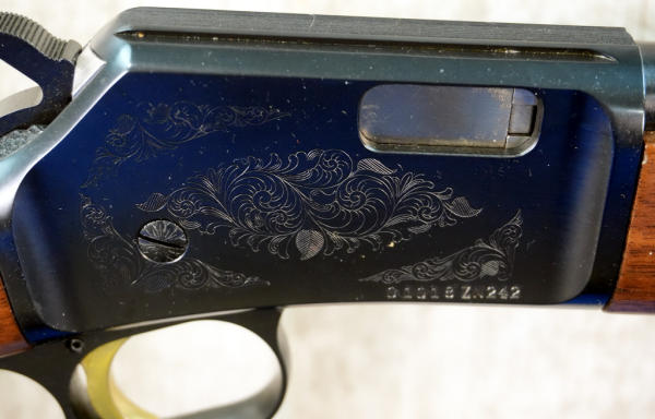20" BBL; full length receiver tube; gold trigger; mint & unfired; plastic butt plate; factory scroll engraving on receiver; high gloss wood stock w/checkering; factory box; Japan; SN#01018ZN242; A-280