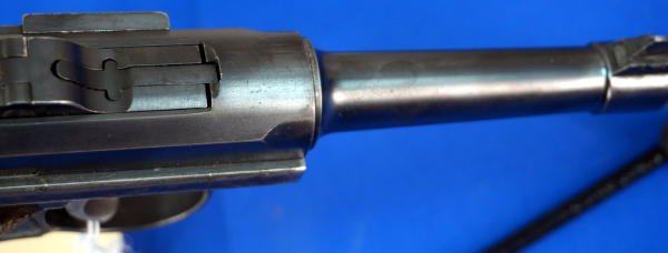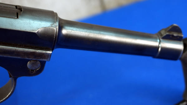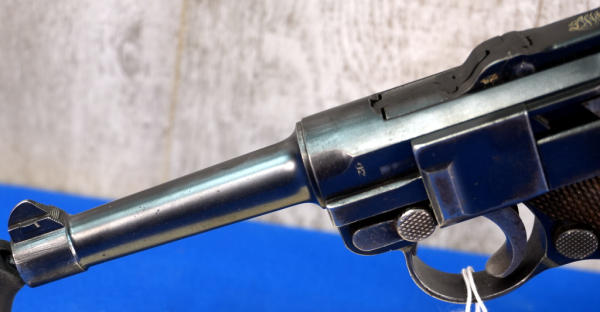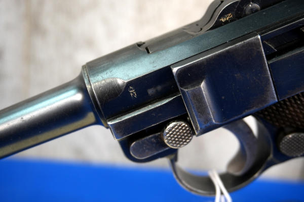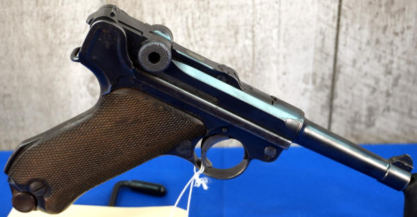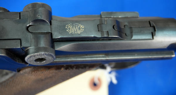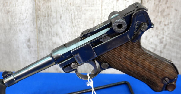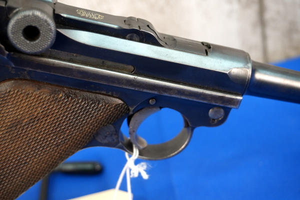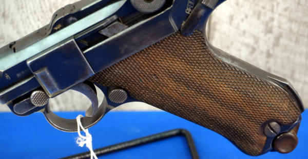 4" Tapered BBL; measures closer to 3.75" but the books consider them 4"; wood checkered grips; DWM on toggle; Crown over N proof mark; not dated; all #'s matching; correct magazine w/wood bottom; has shoulder stock slit on back of grip; nice finish to the bluing; comes with a soft case; Germany; SN#6569; A-292