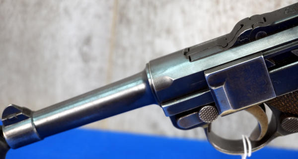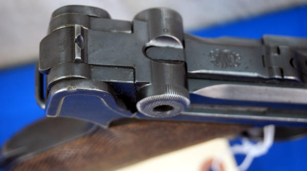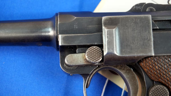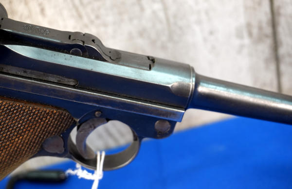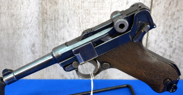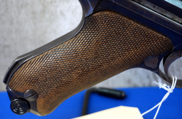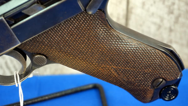 4" Tapered BBL; DWM on toggle; crown over N proof mark; #'s matching; has after market magazine w/plastic base; nice bluing; marked Germany; wood checkered grips; comes w/soft case; Germany; SN#3345; A-292