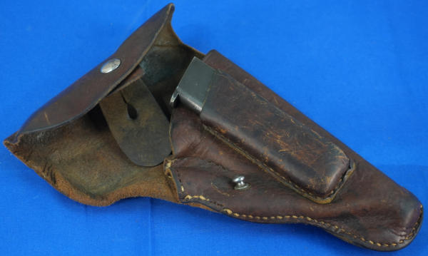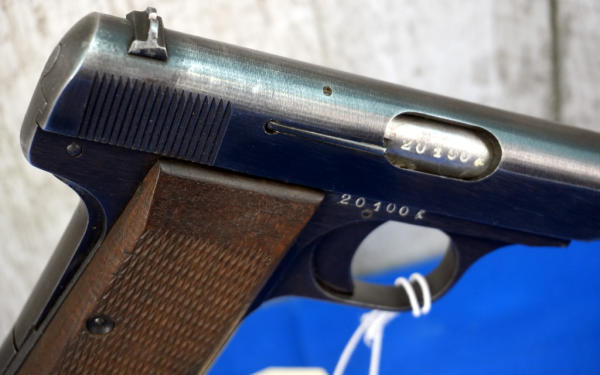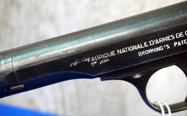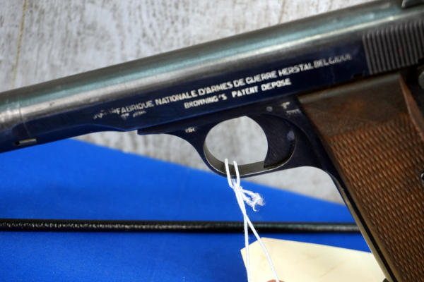 4.5" Stainless Barrel; wood checkered grips; bluing is thin around the muzzle; WaA marked; all the lettering has been filled with white, looks good; 2-magazines; period correct leather holster has some wear; Belgium; SN#20100; A-315
