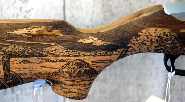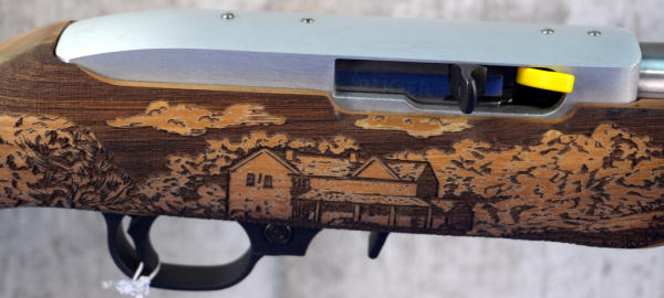 18.5" Stainless BBL; mint & unfired w/factory box; Highly engraved wood stock w/farm scenes and JD Mdl.D tractor w/driver on it!; 1 of 3300 mfg.; USA; SN#AF2-00512; A-295