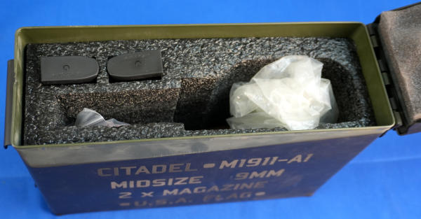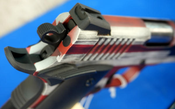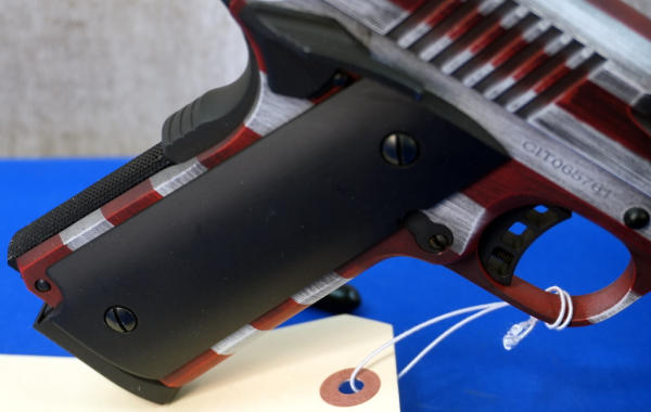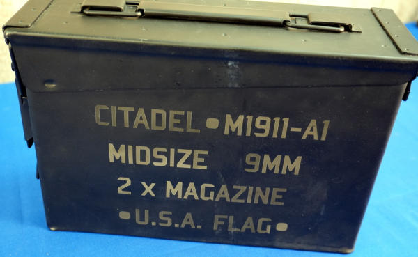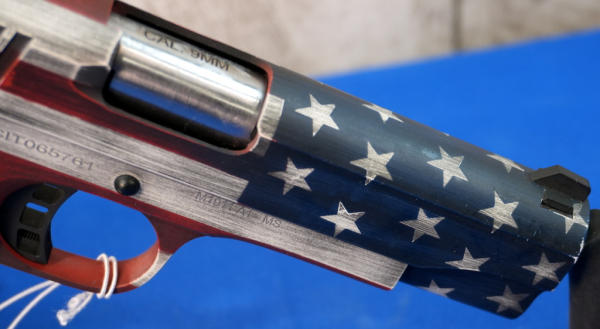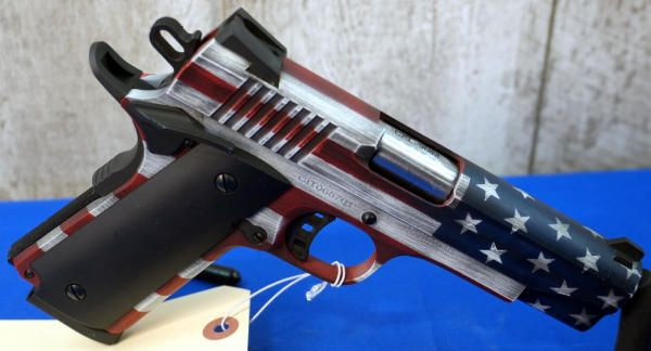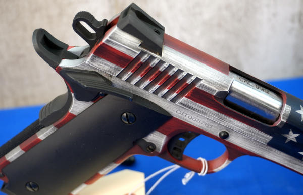 4.25" BBL; US flag Cerakote graphics; mint & unfired w/steel ammo can case; has smooth black grips and includes a set of wood checkered grips; 3-magazines; Philippines; SN#CIT065761; A-255
