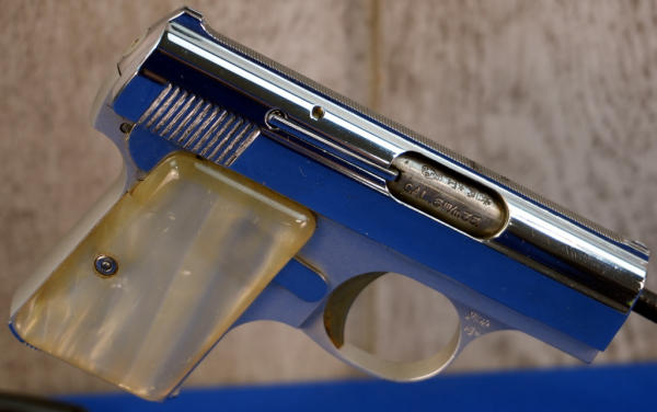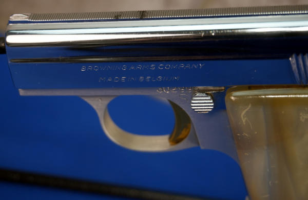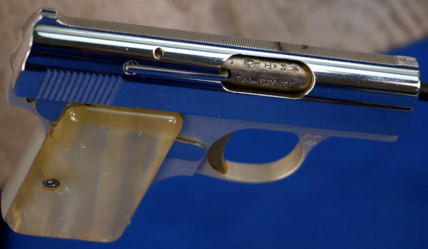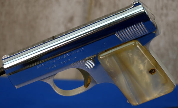 2" Stainless barrel; slide is nickeled and frame is stainless; imitation mother of pearl grips; gold trigger; mfg.1955-68; Belgium; SN#302996; A-302