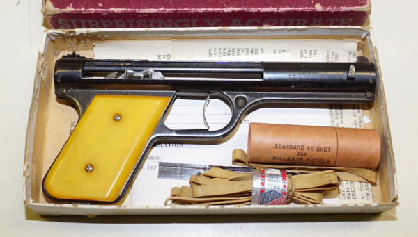 looks complete, box has some splitting on the edges, made by Bulls-eye Manf. Of La Jolla, California, unique piece