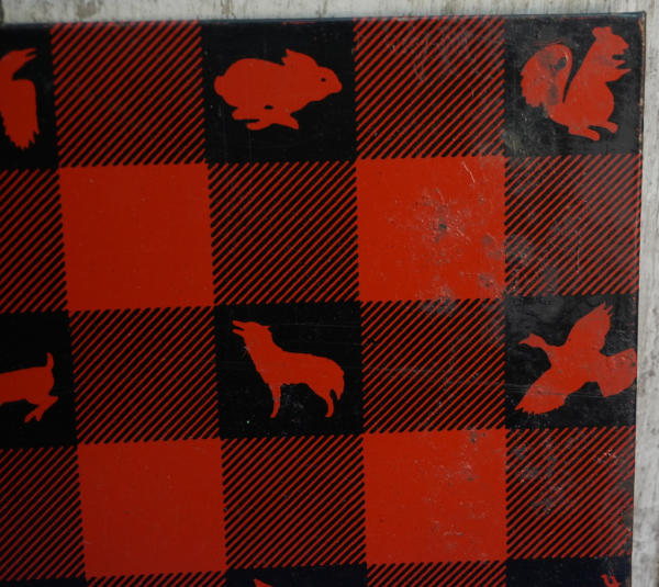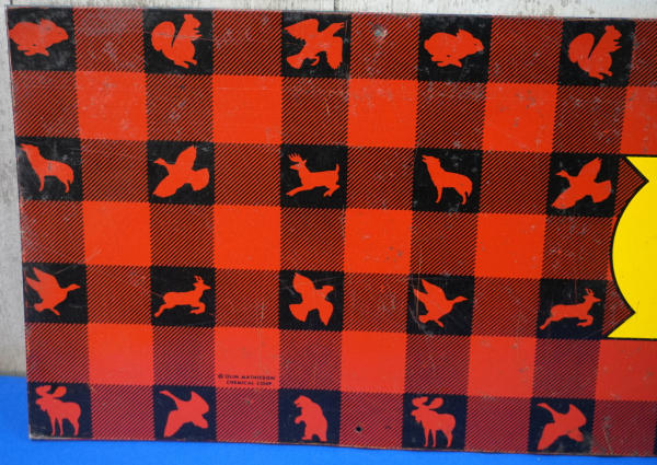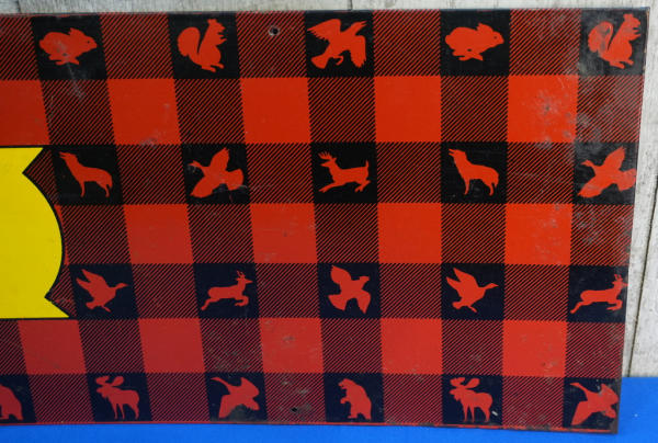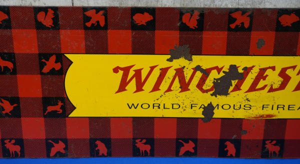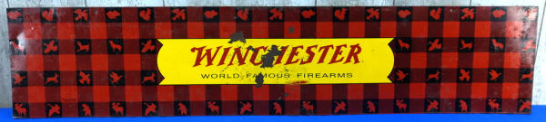 47"x10"; has iconic plaid look w/Winchester logo in middle; does have some paint loss and bubbling; rolled edges; single sided tin; original sign