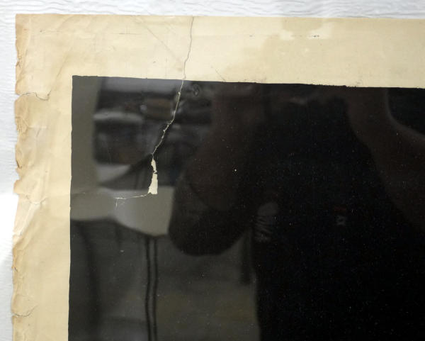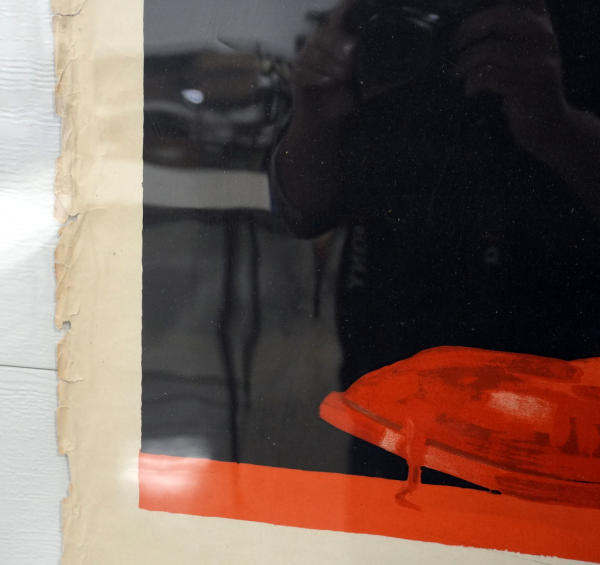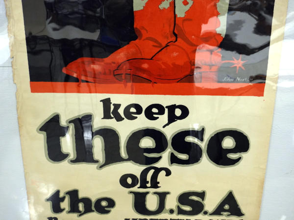 depicts bloody boots; has edge wear and tear on top; in plastic sleeve; 40"x30"