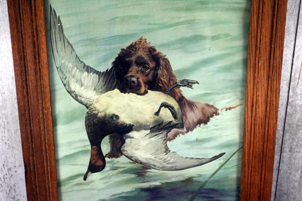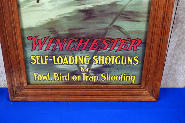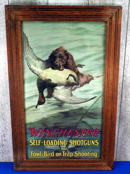 this is a reproduction of an early Winchester print, stamped on the back side; in an older wood frame; sign has some warping but has a good look; glass face, Prefer Local Pickup; 30.5"x19.5"