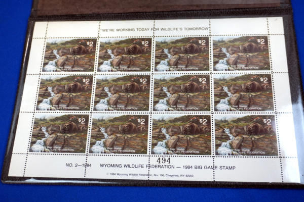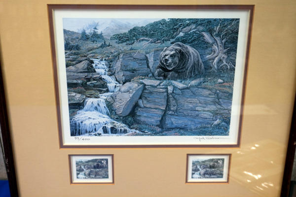 includes a print & two stamps framed, along with a full sheet of stamps and folder; neat seat; framed pieces are faded; glass face; 17"x15"; signed & no.93/400