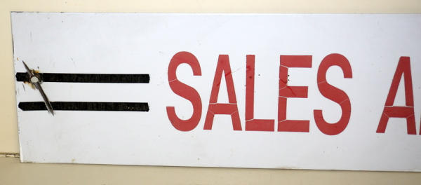 8"x36", faded vinyl letters on metal, has two large marks where a side grinder was used to grind off the bolts