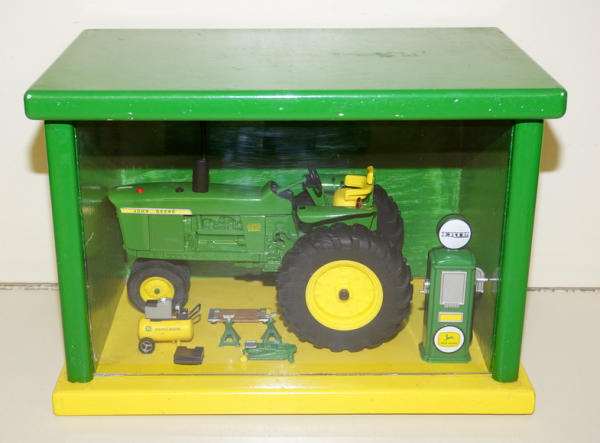 Tractor & parts are glued to the base, displays fine, no box, just the showcase