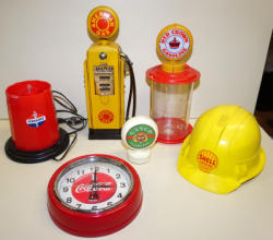 #857 - Lot of Misc Plastic newer gas station collectibles--Shell Hard Hat (cracked), Gas Pumps and Coke clock