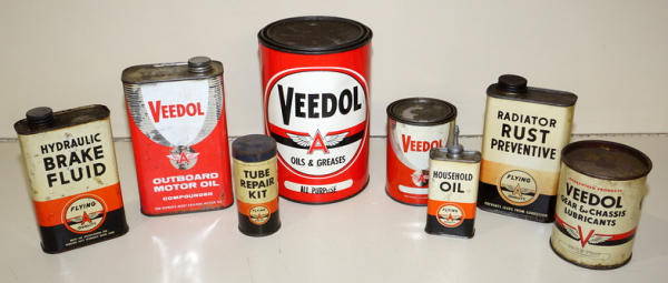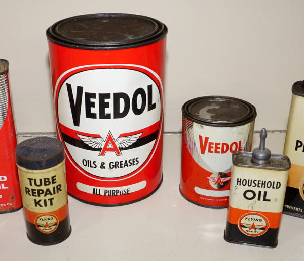 Large grease can is pretty nice, rest have some fading and wear, nice lot for the Veedol collector, all to go