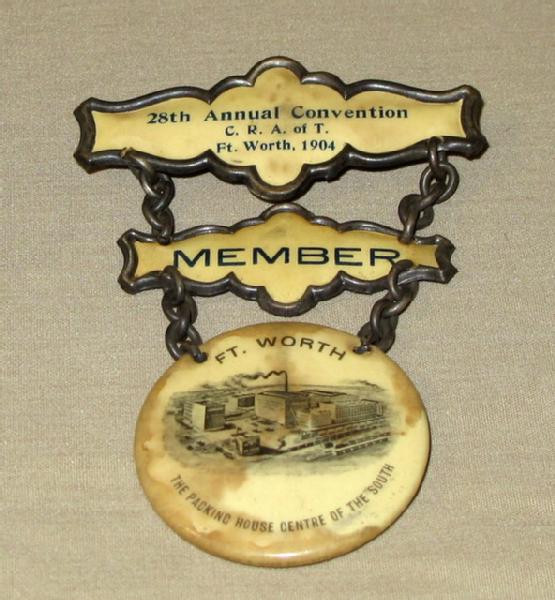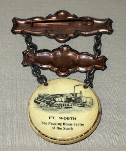 about 3.75" tall, has some discoloration to the celluloid, nice graphics of the packing houses in Ft. Worth