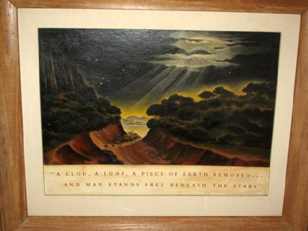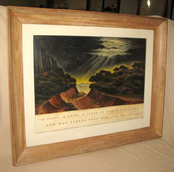 27"x33" framed original industrial illustration. Done for a joint conference of Letourneau & Time Magazine in 1949. Caption Reeds "A Clod, a lump, a piece of earth removed and a man stands free beneath the Stars". Caption line has been torn and repaired, but overall is nice condition for age and material. One of a kind piece for the Construction collector! Graphics is of a wheeled Tourna-Dozer