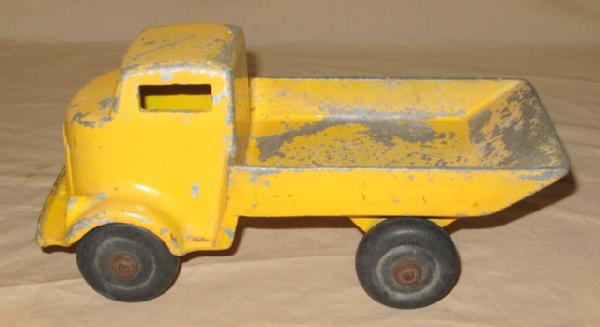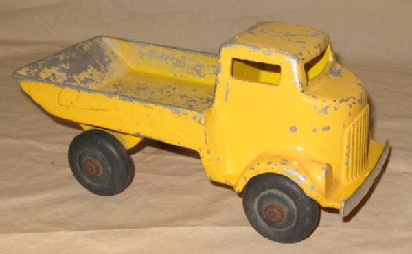 don't know maker, 12" long, paint is about 50%, all one solid diecast piece, no dump mech
