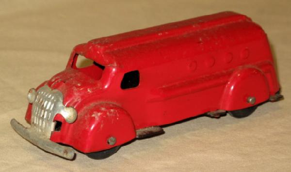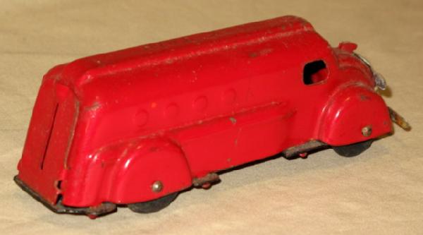 6.5" long, paint is about 80%, still has the stamp on the top "Bank Truck"