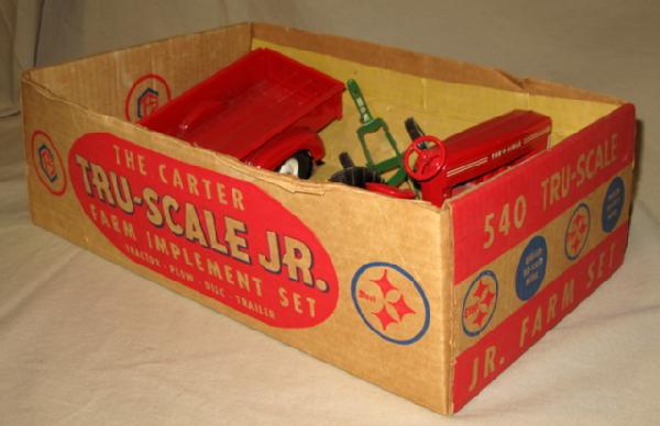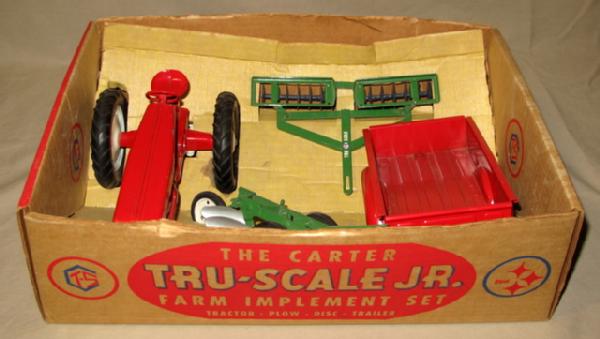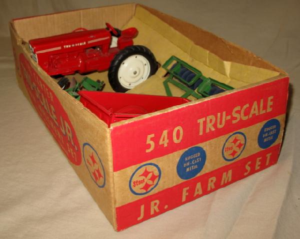has tin rim 401, green disc & plow and Stepside trailer. Toys are all mint to near mint, a few tiny chips on the tractor. Box has some light wear and dusty staining, but still nice, box rates 8 condition