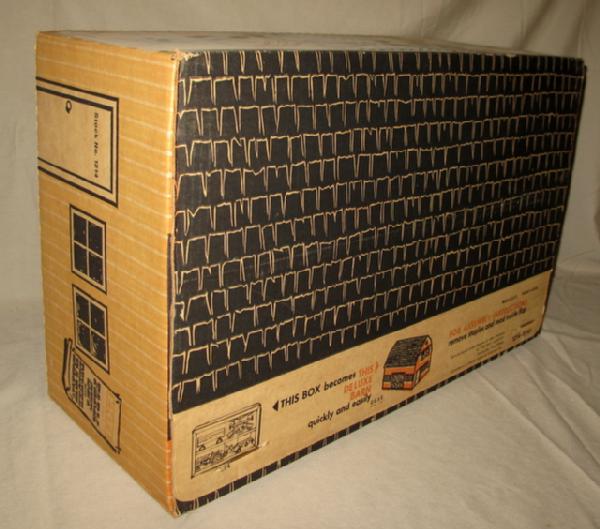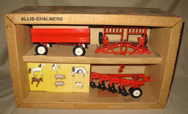 Neat set, includes the Wagon, disc, plow and animals; toys are mint, box is evenly faded; unusual set, box rates 7 condition
