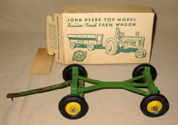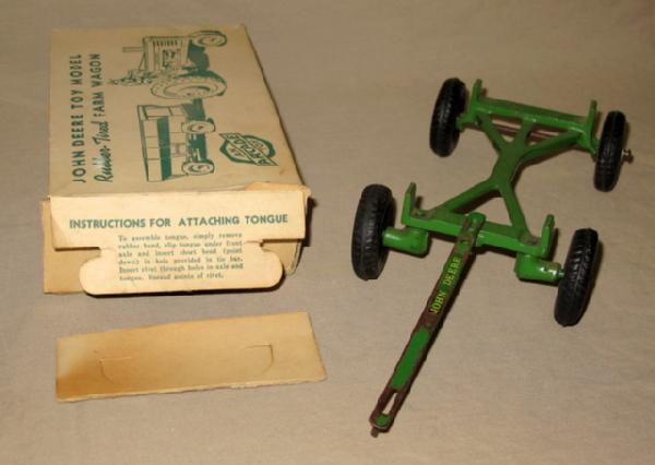 Cast iron gear has nice original paint, 90% or so, tongue has quite abit of wear, tires look good. Box has great graphics, very square, one end flap is torn off, but included, overall box rates 8 condition. We have never sold a boxed version of this before, super scarce!