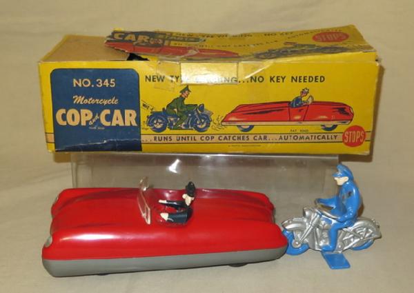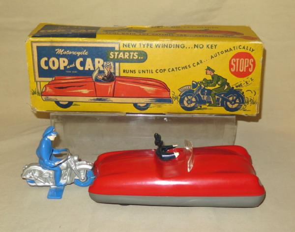 12" long overall, motorcycle is on a pull string that runs the car, works & unique, toy is pretty nice, box is rough on reverse side