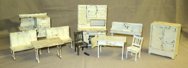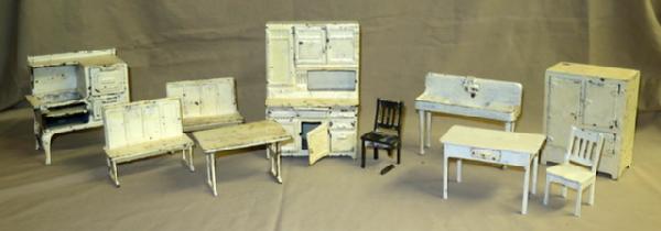 includes the Hoosier, Desk w/ chair, ice box, Sink, Stove, Table & 2 benches, most pieces look to be an old repaint, stove is missing a few pieces, rest look pretty complete, Hoosier is 8" tall, also includes a reproduction chair with a broken leg, sells as a set for one money, very hard to find set!