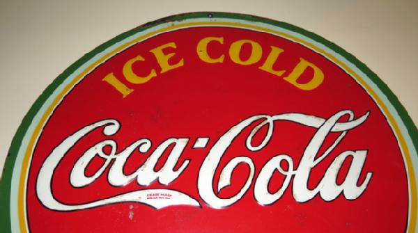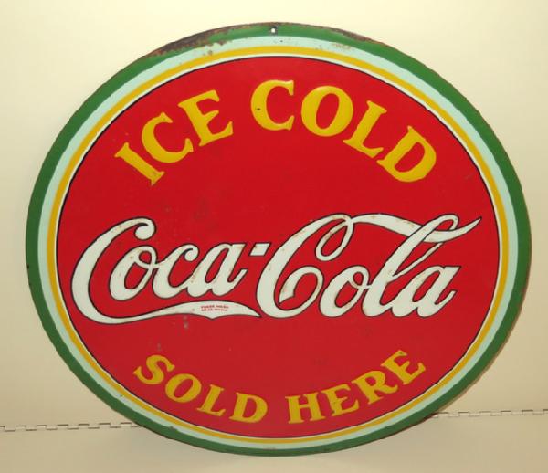 Super scarce sign, made by American Art Works, dated 1933, 20" diam, few small chips and spots, light paint loss on the top edge, but overall a super piece, rates 8 condition
