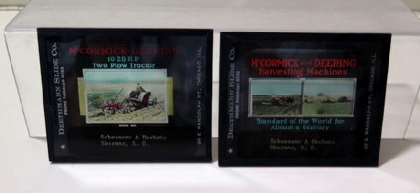one with harvesting machines, one with tractor and plow, each 4"x3.25", small hairline cracks in each, sells 2x the money