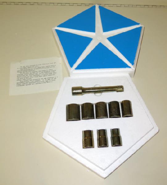 Unique Set, 8 sockets plus extension in a Styrofoam display box in the shape of the Chrysler emblem, all in the original shipping box with the paper explaining what they are for. They were an award in 1975 for MTSC. Neat set