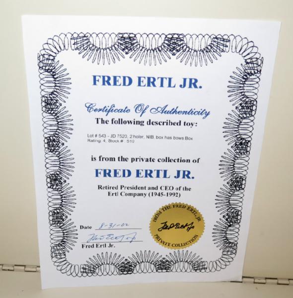 different variation than the 7520 earlier in the auction, has 1-piece air cleaner & no brace in cab, comes with the Fred Ertl Certificate. Toy is mint, box bows a little at the top, box rates 8 condition